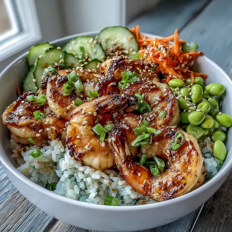 Save to Pinterest The combination of warm jasmine rice and cold, crisp vegetables creates a delightful contrast in every bite. This bowl is designed to be both nourishing and aesthetically pleasing, featuring bright orange carrots, green edamame, and perfectly pink grilled shrimp.