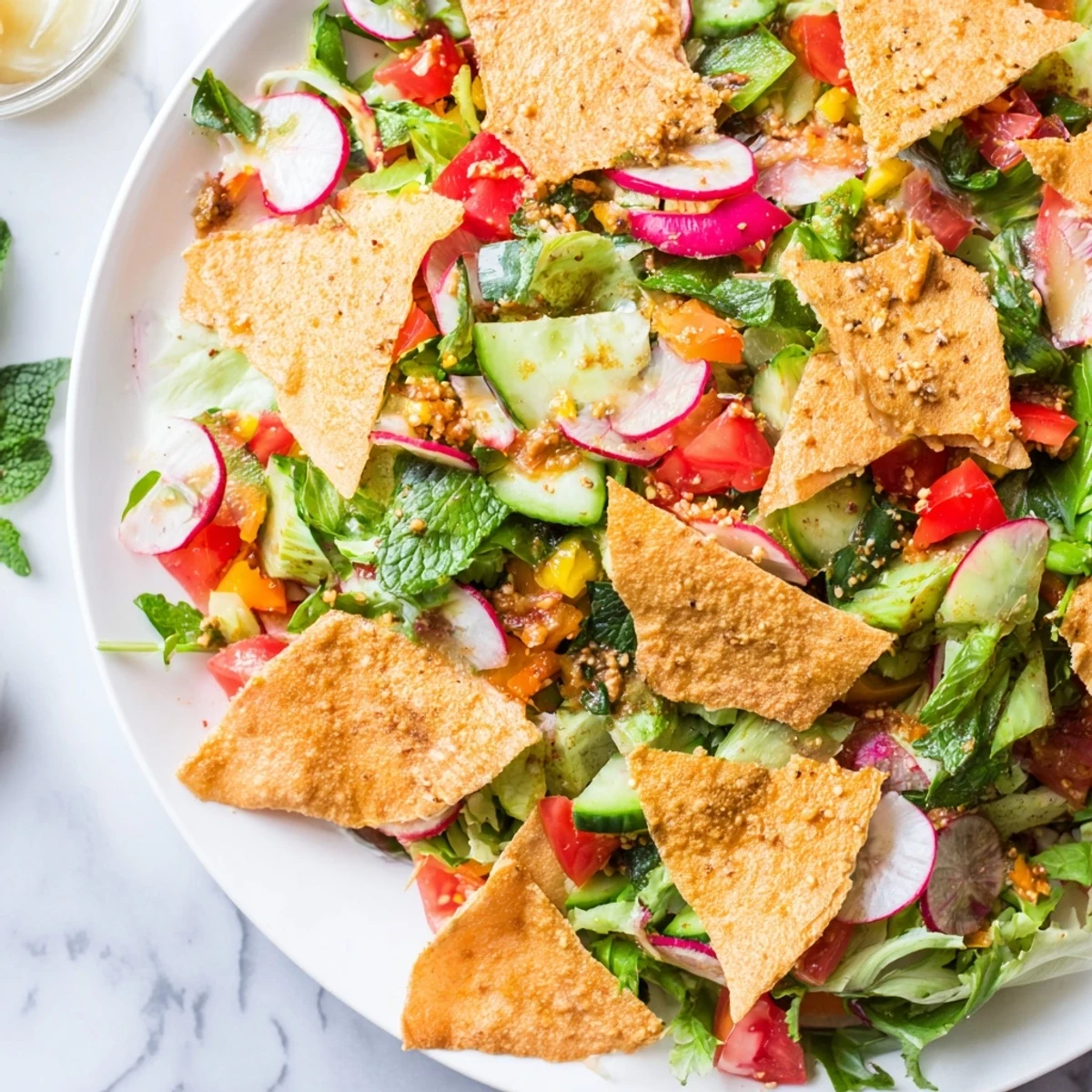 Some people add crumbled feta or kalamata olives for a richer, more substantial meal, which transforms this into something closer to a main course than a side dish. Others top it with grilled chicken, falafel, or lamb to turn it into a complete plate, letting the dressing do the work of tying everything together. The beauty of fattoush is that it's a framework for whatever you want to build around it.