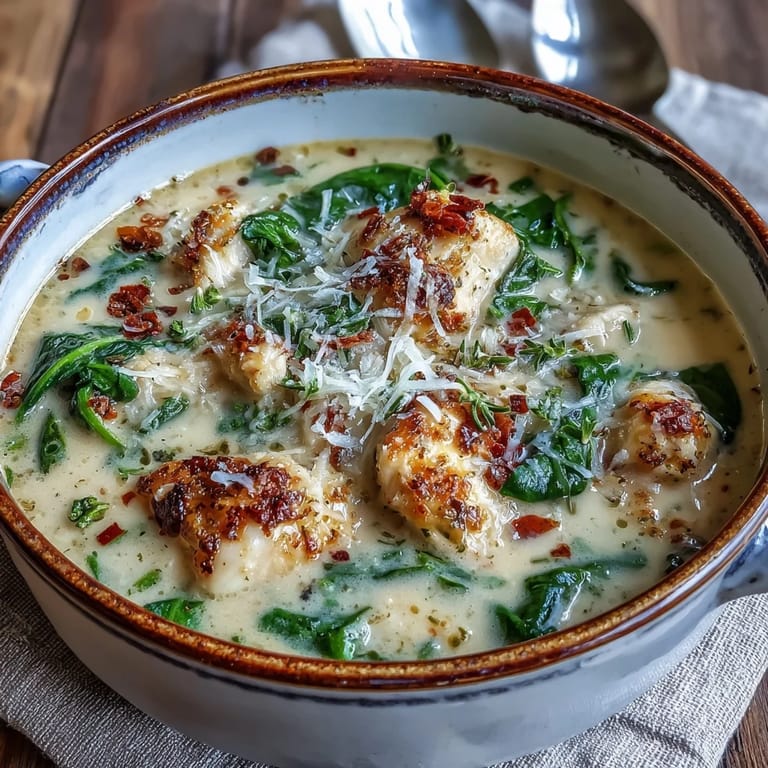 Save to Pinterest The sizzle of garlic hitting hot olive oil is what always gets me. One chilly October evening, I threw together this soup using leftover chicken and a wedge of Parmesan I'd been hoarding. The kitchen filled with that unmistakable toasty-sharp aroma, and within half an hour, I had bowls of creamy, soul-warming comfort that tasted like I'd been simmering it all day. My partner wandered in, sniffed the air, and declared it better than any restaurant version we'd tried.