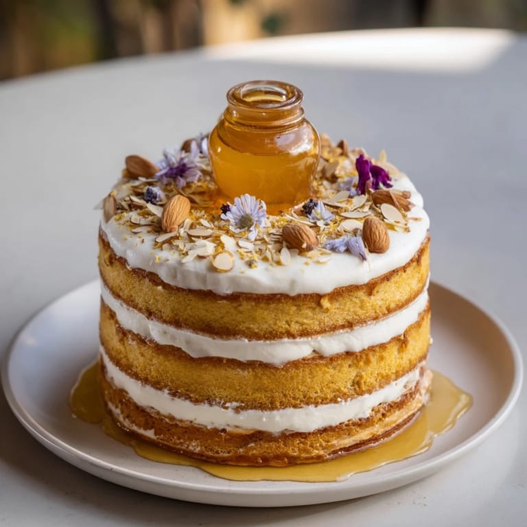 This dessert wants to be surrounded by intention. Moscato or late-harvest Riesling beside it makes sense—sweet but not heavy, with enough acidity to cut through the richness. Serve it on a cake stand or shallow platter so the honey pot sits naturally, and let people serve themselves rather than plating individual slices. The edible flowers aren't necessary, but they soften the presentation and make it feel like something special happened in your kitchen.